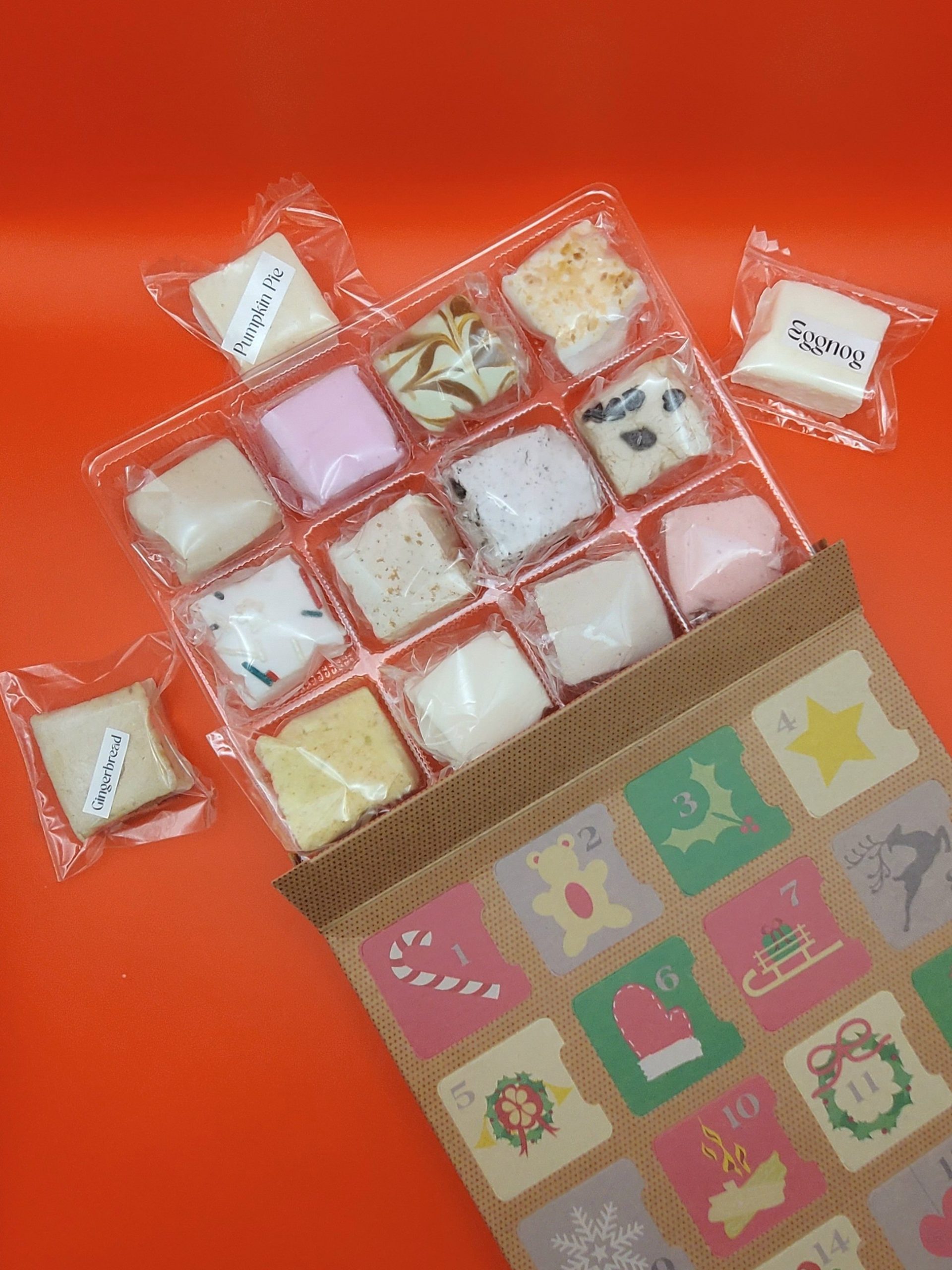 Advent boxes include 24 Marshmallows in 24 unique flavors! Each marshmallow is individually sealed and labeled. Packaged in a decorative advent box with number windows.