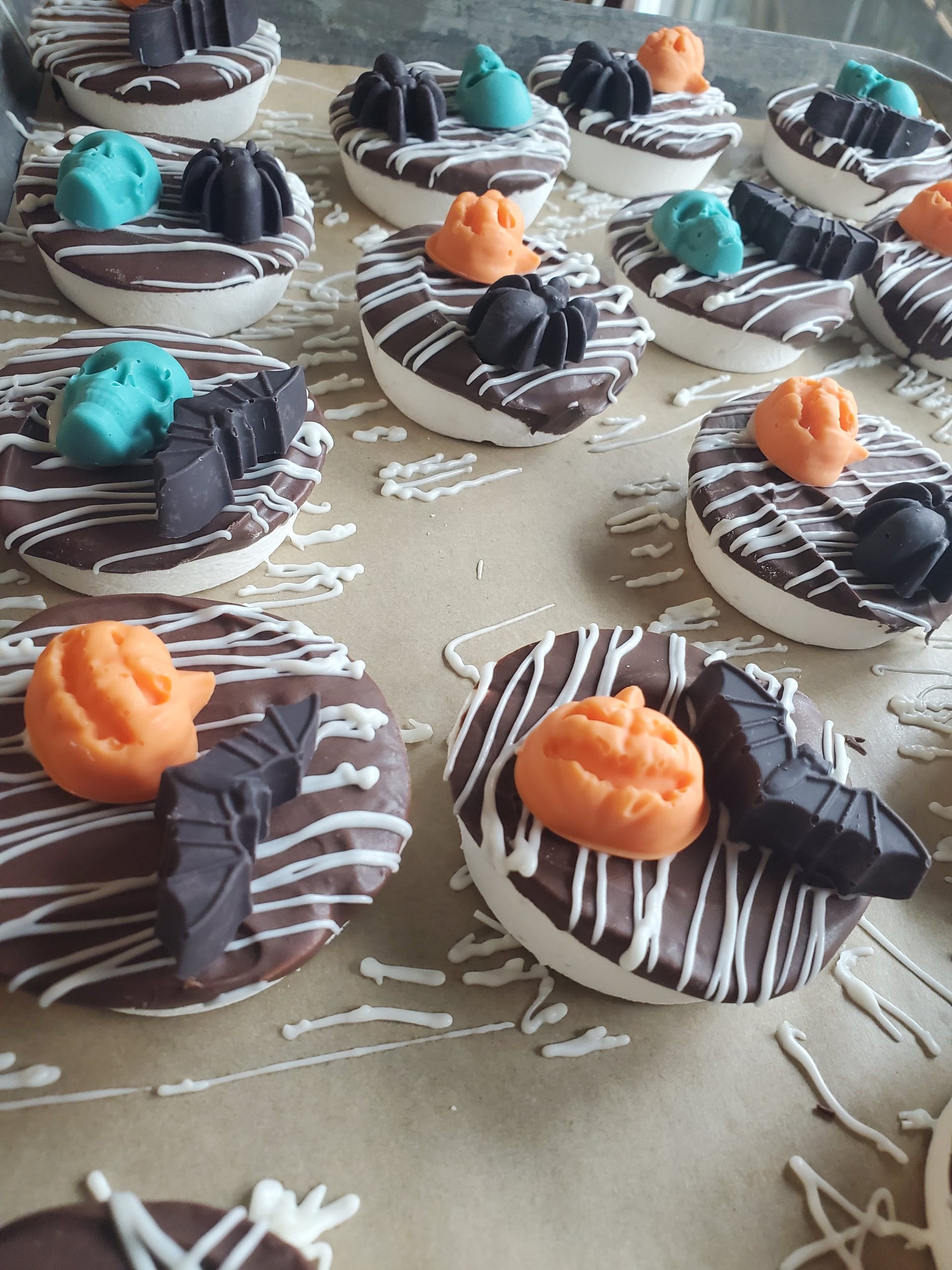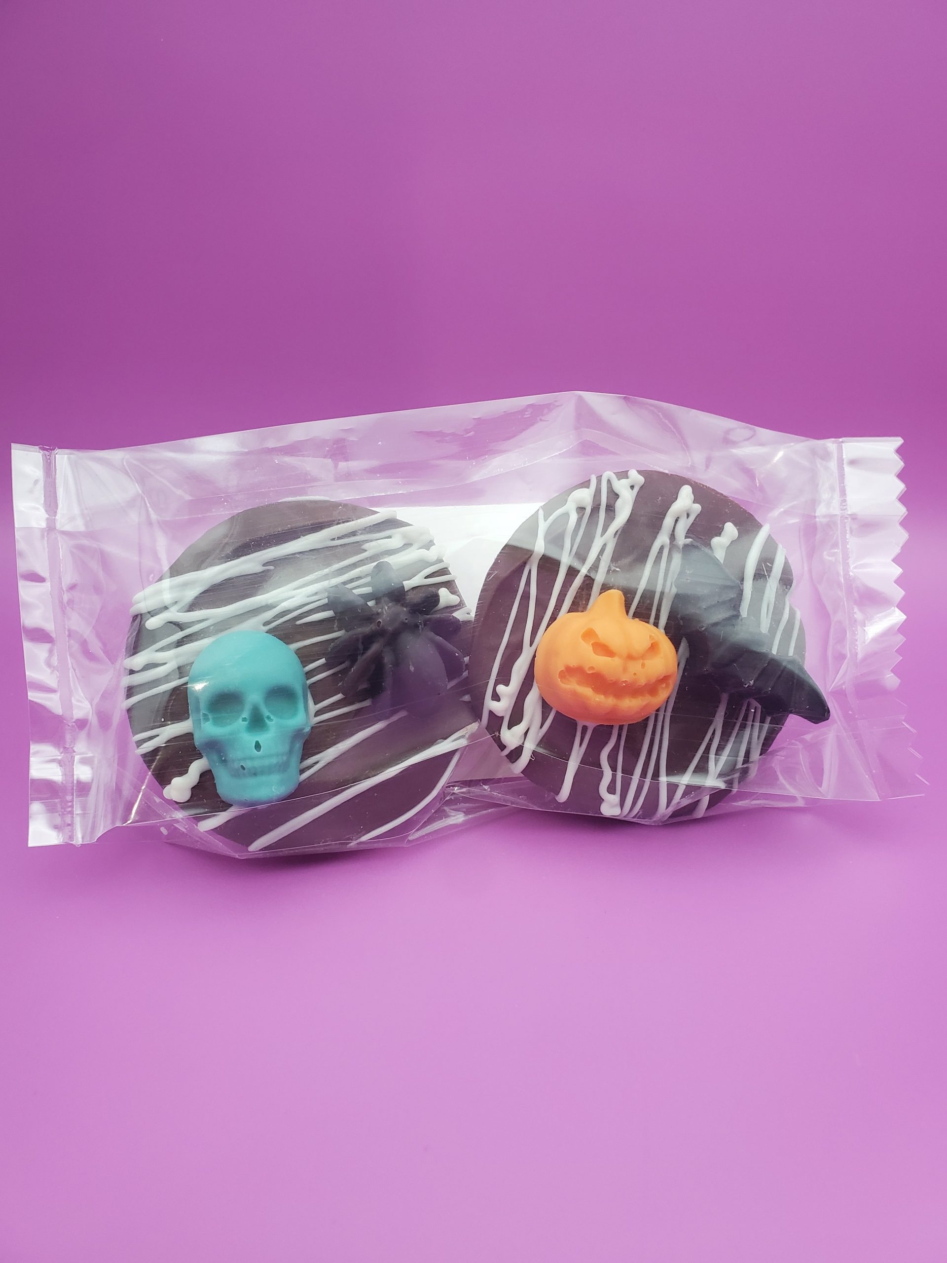 Marshmallow Discs decorated and topped with Chocolate. Perfect size for your mug of coffee or hot chocolate! (Each package contains 2)