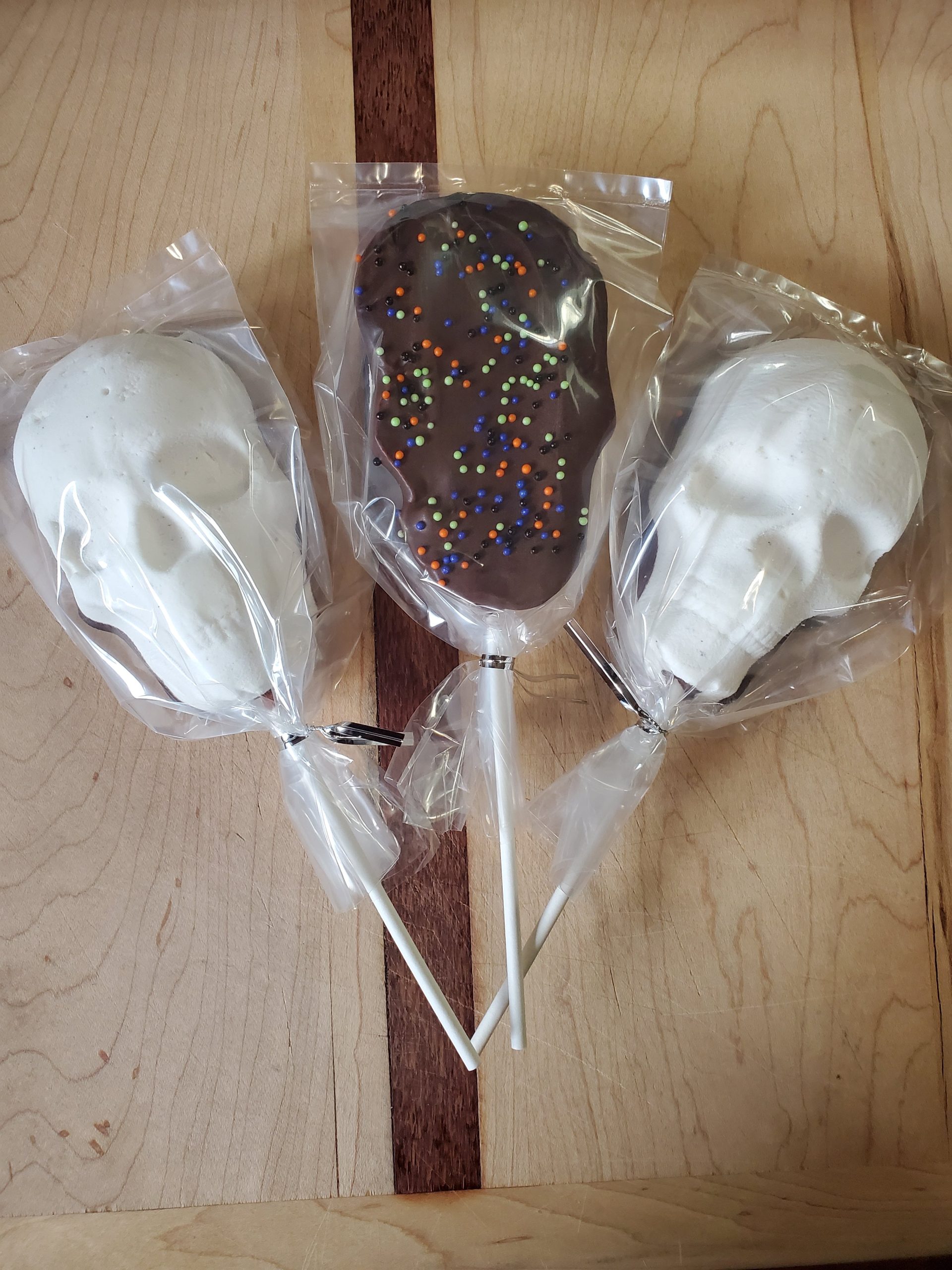 Skull Pop made with Vanilla Bean Marshmallow. Dipped in milk chocolate and topped with sprinkles.