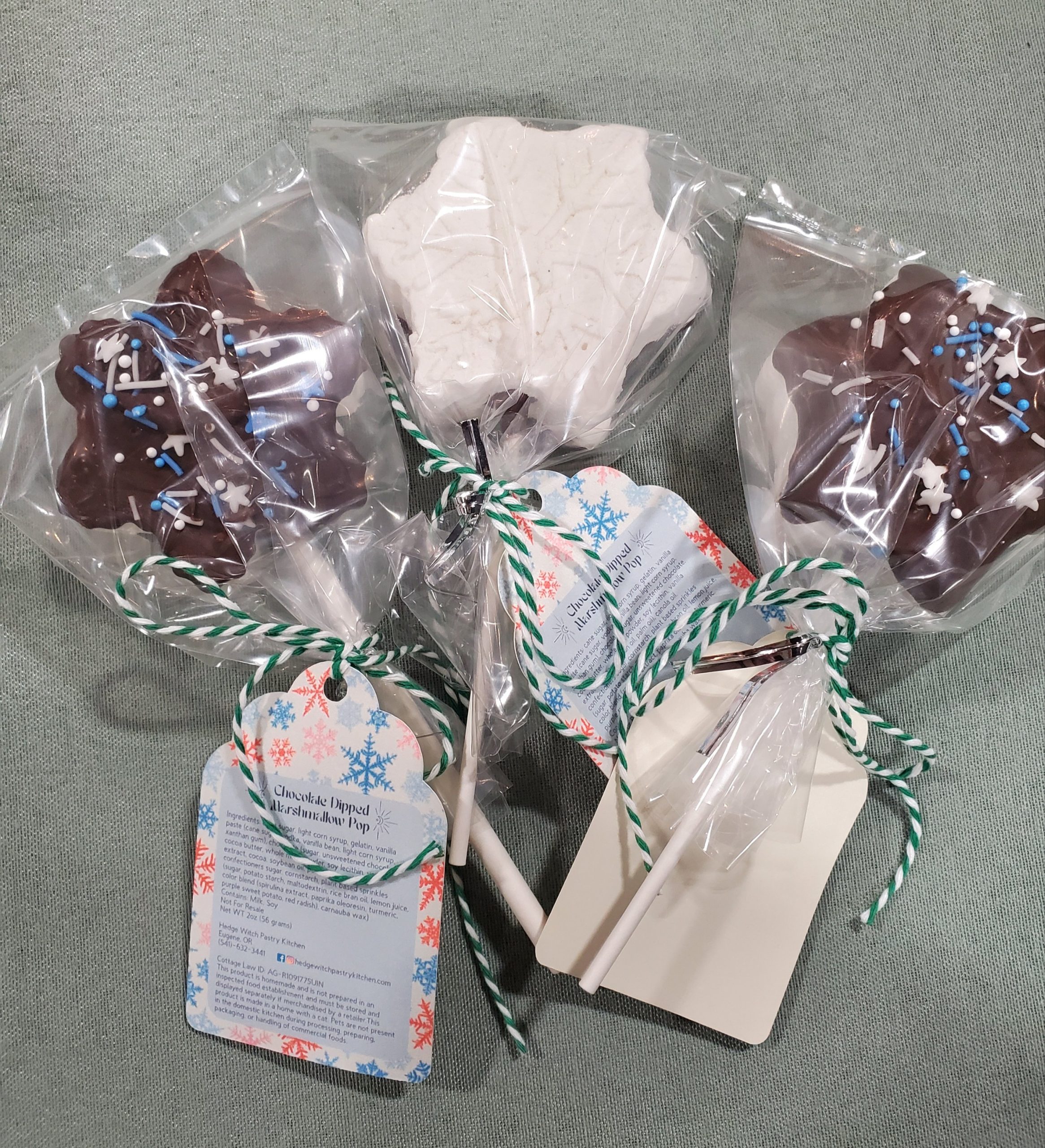 Vanilla Bean Marshmallow dipped in milk chocolate, decorated with plant based holiday sprinkles
